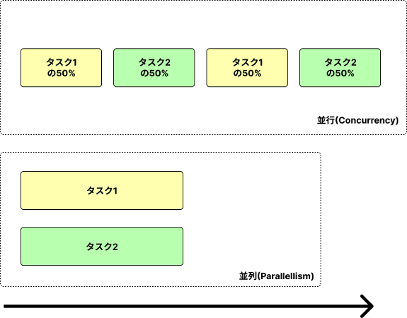 人間が意識できない短い時間で切り替えを反復するため、複数の作業を同時に行えているかのように見えます。 対して並列(Parallelism)は本当に複数の作業を同時に行うことを意味します。